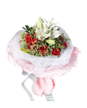 16 red roses, 3 perfume white lilies, with green leaves