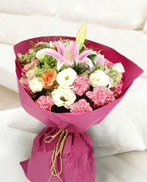 A pink lilies,9 pink carnations,6 white gentian, 3 orange roses; lace, rose red circular Cotton paper packaging;